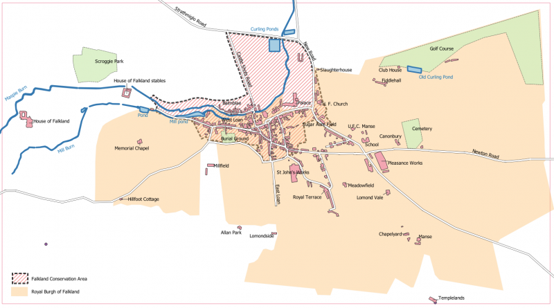 Map of the Royal Burgh of Falkland showing the Conservation Area. (c) Ross Burgess, 2021. Enhanced version of Map C from Playfair and Burgess