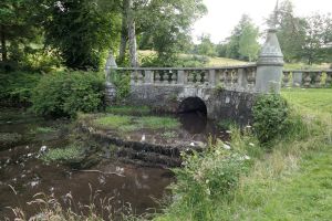 These two bridges cross the Mill Burn each end of the pond near the East Lodge of the Falkland designed landscape. One of them carries the path leading up to the Memorial Chapel. The other is not really a bridge but exists as two separate ornamental arches either side of the East Lodge.