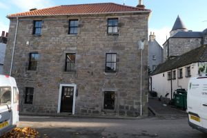 18 and early 19 centuries. Originally 2-storey 3-window, now 3-storey 3-window droved rubble, mouled eaves course, piended roof, modern concrete tiles; largely reglazed. | |